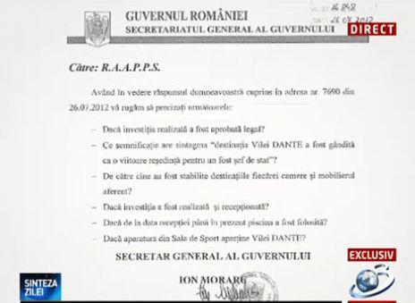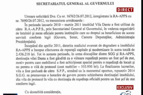 - SGG a solicitat, joi, RA-APPS noi informaţii legate de Vila Dante, şi anume dacã investiţia a fost aprobatã legal, ce semnificaţie are sintagma "destinaţia Vilei Dante a fost gânditã ca o viitoare reşedinţã pentru un fost şef de stat", din adresa anterioarã a regiei, de cãtre cine au fost stabilite destinaţiile fiecãrei camere şi mobilierul aferent, dacã investiţia a fost realizatã şi recepţionatã, dacã de la data recepţiei şi pânã în prezent piscina a fost folositã şi dacã aparatura din sala de sport aparţine Vilei Dante.