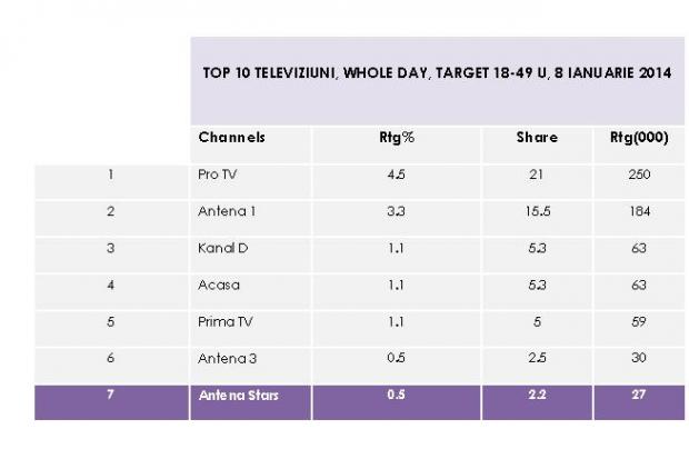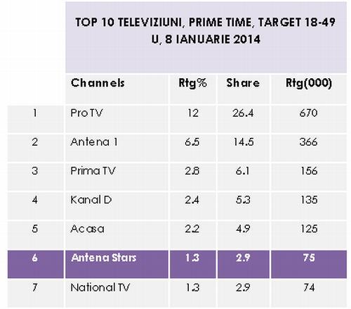 În medie, peste 75.000 de telespectatori din targetul 18-49 Urban, priveau aseară producţiile din prime-time-ul Antenei Stars, adică o medie de rating de 1,3% şi de market share de 2.9%. Şi la nivelul întregii zile, pe aceeaşi categorie de public, postul era urmărit în medie de 27.000 de telespectatori, cu o audienţă medie de 0,5 puncte de rating şi o medie de market share de 2,2%. Astfel,în topul televiziunilor de pe piaţă, pe parcursul întregii zile, pe targetul commercial, Antena Stars, ocupa un onorant loc şase.
