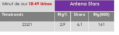 Şi în prime time, pe targetul 18-49 Urban, Antena Stars s-a clasat ieri pe un loc care îi face cinste unui televiziuni de nişă, la nici o lună de la relansare.