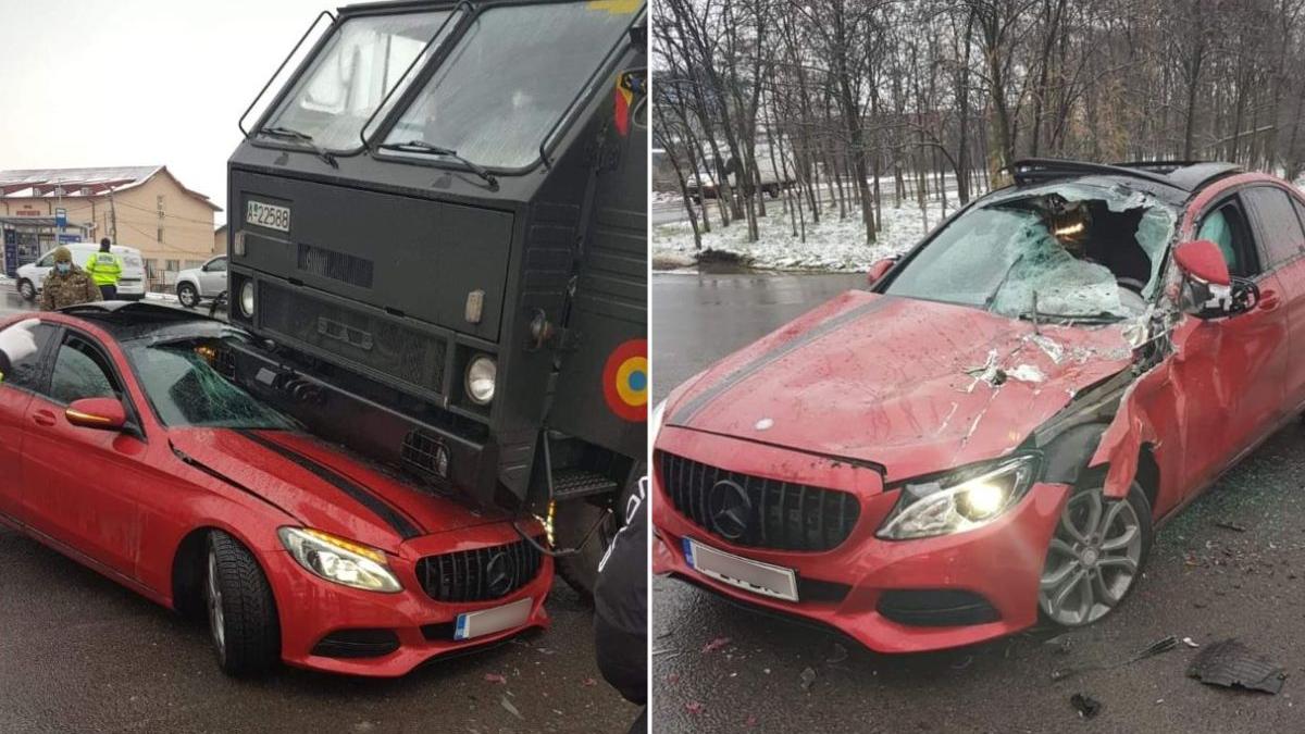 Mercedes-ul în care se afla tânăra de 24 de ani a fost strivit de camionul Armatei, iar impactul a fost unul serios. Tânăra şoferiţă a fost rănită, însă a scăpat cu viaţă.