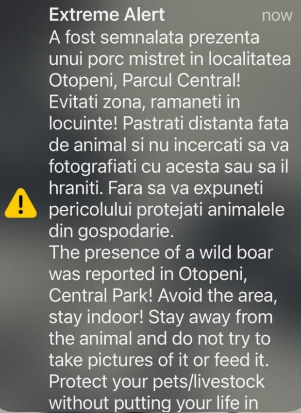 Locuitorii din Otopeni au fost avertizaţi prin sistemul RO-ALERT că există un porc mistreţ în oraşul lor. Fiind alertă extremă, autorităţile le-au recomandat oamenilor să nu iasă din locuinţe, iar în cazul în care se întâlnesc cu animalul sălbatic să păstreze distanţa.