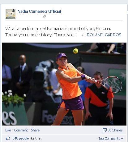 "Ce performanţă! România este mândră de tine, Simona. Azi, ai făcut istorie. Îţi mulţumim!", a scris Nadia Comăneci pe pagina sa de Facebook.