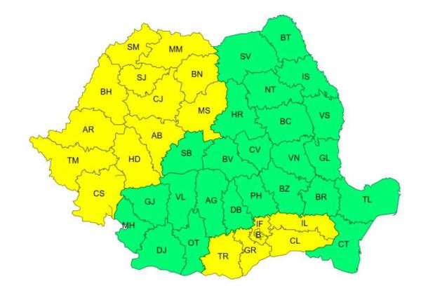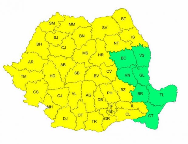 Aşa cum se poate observa în imaginea de mai jos, aproape toată România este vizată de avertizarea meteorologilor. Doar judeţele Bacău, Vaslui, Vrancea, Galaţi, Brăila, Tulcea şi Constanţa nu se află sub cod galben de caniculă astăzi.