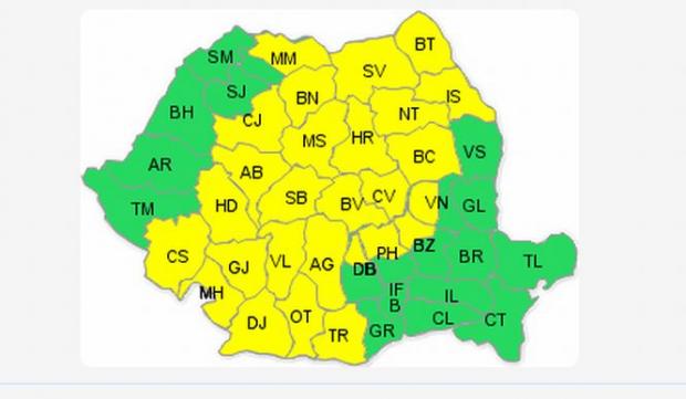 Avertizarea cod galben a fost emisă pentru judeţele Maramureş, Bistriţa-Năsăud, Harghita, Covasna, Mureş, Cluj, Alba, Hunedoara, Sibiu, Braşov, Suceava, Botoşani, Iaşi, Neamţ, Bacău, Vrancea, Buzău, Prahova, Dâmboviţa, Argeş, Dolj, Olt, Gorj, Teleorman, Vâlcea, Mehedinţi şi Caraş-Severin.