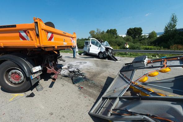 Pe un segment în care viteza maximă era limitată la 80 de km/h din cauza unor lucrări, şoferul unui microbuz în care erau români a lovit din spate un autocamion cu remorcă staţionat. Vehiculul pentru lucrări de întreţinere era staţionat legal în afara zonei de rulare, pe o bandă temporar închisă circulaţiei.