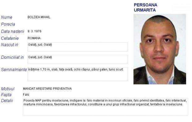 Profilul lui Mihail Boldea a apărut şi pe site-ul Poliţiei Române la rubrica "Persoane Urmărite"