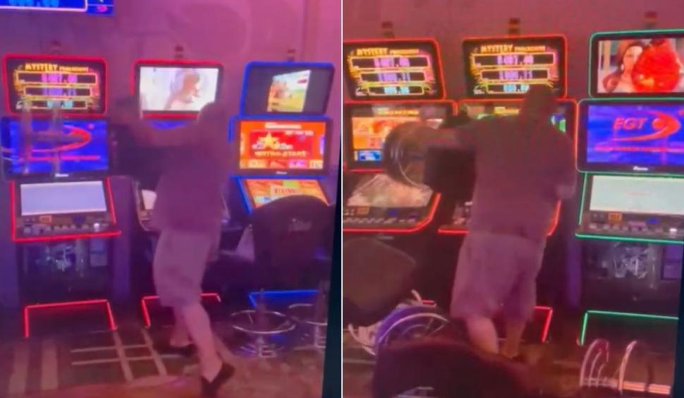 Bărbatul a fost filmat în timp ce distrugea aparatele de păcănele din sala de jocuri, cu un scaun.