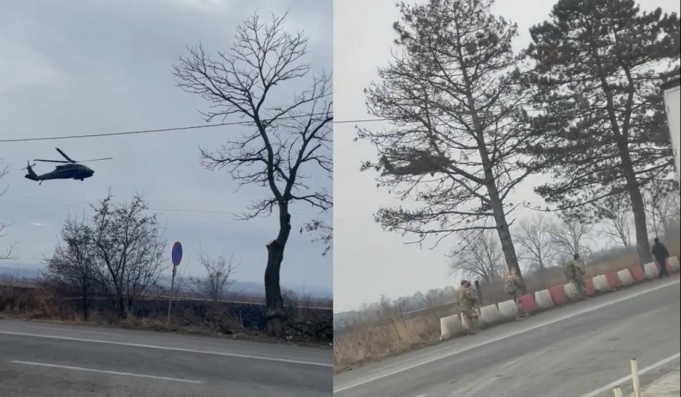 Pe imagini se vede că un avion Black Hawk aterizează pe câmp, în Siret, județul Suceava.