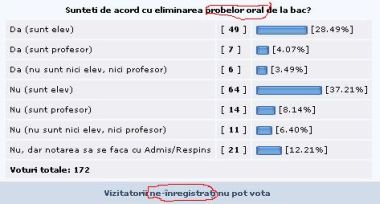 ?Scăparea? celor de la minister era un prilej pe care marea familie a elevilor îl putea folosi, atacându-i prin comentarii acide. Dar, surpriză! Niciun vizitator al forumului nu a sesizat sau criticat greşeala de pe site. S-ar fi zis că din neatenţie a trecut neobservată eroarea din titlu. Finalul sondajului, însă, se lasă cu o nouă profanare a legilor gramaticale: "Vizitatorii ne-înregistraţi nu pot vota".