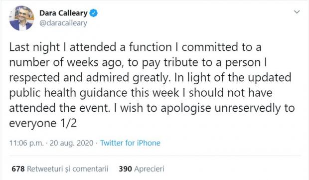 Dara Calleary, ministrul Agriculturii din Irlanda, a demisionat, joi, după ce a participat la un eveniment cu peste 80 de persoane, pe un teren de golf. Totul a avut loc la doar o zi după ce autoritățile din Dublin au anunțat măsuri mai dure de restricție din cauza creșterii numărului de cazuri de coronavirus.