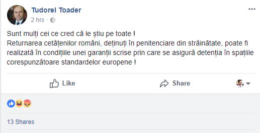 "Sunt mulţi cei ce cred că le ştiu pe toate! Returnarea cetăţenilor români deţinuţi în penitenciare din străinătate poate fi realizată în condiţiile unei garanţii scrise prin care se asigură detenţia în spaţiile corespunzătoare standardelor europene", a scris Tudorel Toader.
