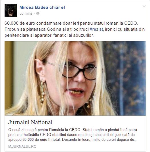 ''60.000 de euro condamnare doar ieri pentru statul român la CEDO. Propun să plătească Godină și alți politruci #rezist, ironici cu situația din penitenciare și apărători fanatici ai abuzurilor'', a scris Mircea Badea.