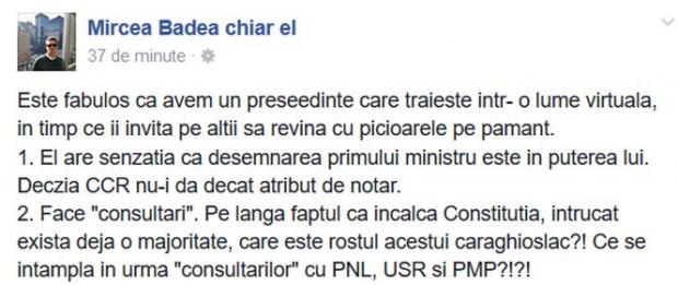 2. Face "consultari". Pe langa faptul ca incalca Constitutia, intrucat exista deja o majoritate, care este rostul acestui caraghioslac?! Ce se intampla in urma "consultarilor" cu PNL, USR si PMP?!?!”, a scris Mircea Badea, marți, pe pagina sa de Facebook.