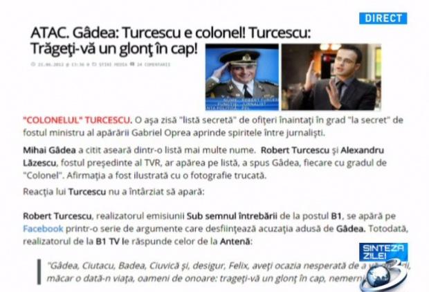 ''În 2012 am difuzat o dezvăluire de proporții cu privire la niște grade ce au fost acordate la secret. De exemplu, Robert Turcescu era făcut colonel al Armatei Române. Pe acea listă erau mult mai mulți, dar era momentul îm care descopeream că există niște interese și un gest de răsplată pentru cei care erau cunoscuți ca fiind slujbașii puterii din presă. Impresia noastră a fost că era vorba doar de o apropiere nefirească dintre presă și politicieni, neștiind că de fapt Turcescu era chiar locotenent-colonel sub acoperire după cum singur s-a denunțat.