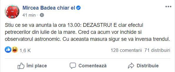 ”Știu ce se va anunța la ora 13.00: DEZASTRU! E clar efectul petrecerilor din iulie de la mare. Cred că acum vor închide și observatorul astronomic. Cu această măsură sigur se va inversa trendul”, scrie Mircea Badea pe Facebook.