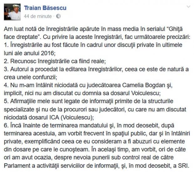 Fostul preşedinte susţine că înregistrările au fost făcute în cadrul unor discuţii private în ultimele luni ale anului 2016. Băsescu susţine însă că discuţia a fost editată pentru a crea unele confunzii, însă nu explică în ce mod ar fi fost modificată înregistrarea.