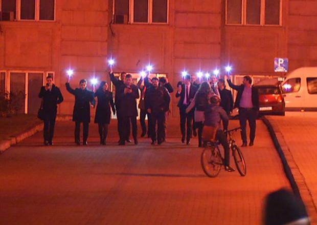 Ciuvică i-a imitat pe parlamentarii USR care au părăsit ca niște eroi clădirea Parlamentului ținând simbolic în mâini telefoanele cu lanternele aprinse, în aplauzele susținătorilor lor.