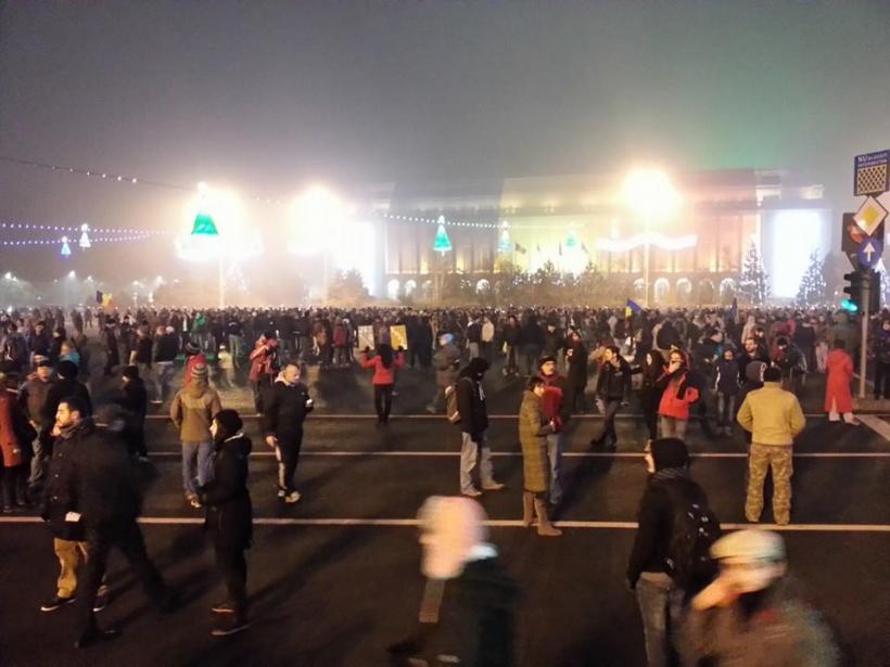 Sute de persoane, în majoritate tineri, protestează la Universitate faţă de modificările aduse Codului penal, dar şi faţă de situaţia de la Pungeşti, strigând "Uniţi, salvăm toată Romînia" şi "De Crăciun şi Revelion fără Ponta şi Chevron".