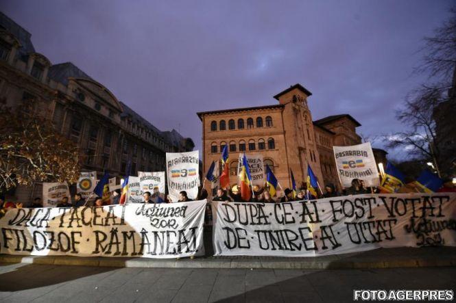 Câteva zeci de persoane au protestat sâmbătă seara, în Piața Universității, față de poziția exprimată de președintele Klaus Iohannis în ceea ce privește unirea cu Republica Moldova, scandând mesaje unioniste și afișând pancarte critice la adresa declarațiilor șefului statului pe acest subiect, informează agerpres.ro.