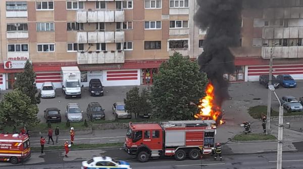 Alertă în fața unui supermarket din Arad, după ce o mașină a luat foc și o persoană a murit
