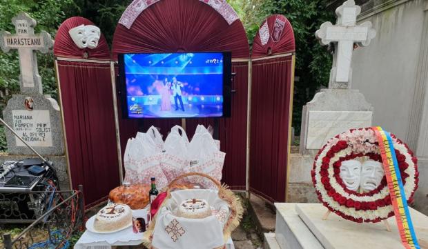 În fața monitorului a fost amplasată o masă, pe care au fost așezate alimentele specifice unei ceremonii de parastat, precum colivă și pască.