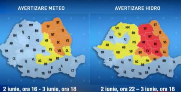 Județe vizate de codul portocaliu sunt Vrancea, Bacău, Vaslui, Neamţ, Iaşi, Suceava, Botoşani, unde ploile vor avea caracter torenţial şi se vor depăşi local 50 l/mp şi izolat, mai ales în zona de munte, 80-100 l/mp.