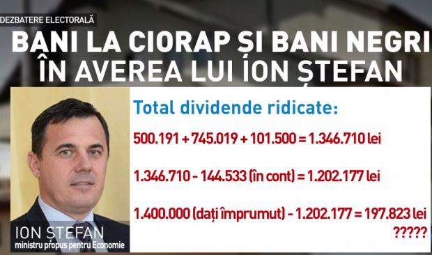 Oana Zamfir a analizat declarațiile de avere ale lui Ion Ștefan. În 2016 acesta nu avea niciun ban în conturi, a primit însă dividende de 500.000 lei. Un an mai târziu, 150.000 de lei sunt în cont și alte 745.000 lei primește dividende.