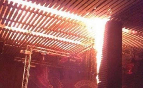 În imagini se vede clar cum focul artificiilor se îndreaptă spre stâlpii izolaţi cu buretele de antifonare din club.