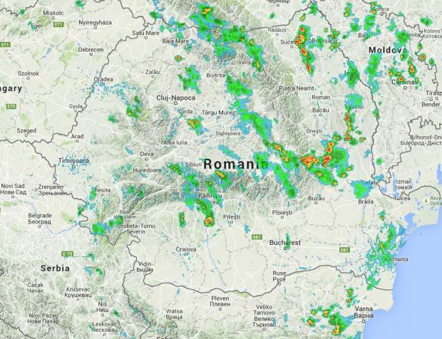 Fenomene meteorologice asteptate: averse ce vor depăşi 25 l/mp, frecvente descărcări electrice, intensificări de scurtă durată ale vântului, grindină de mici dimensiuni.