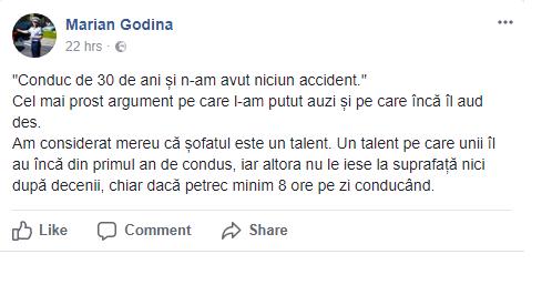 Am considerat mereu că șofatul este un talent. Un talent pe care unii îl au încă din primul an de condus, iar altora nu le iese la suprafață nici după decenii, chiar dacă petrec minim 8 ore pe zi conducând", a scris Marian Godină pe Facebook.