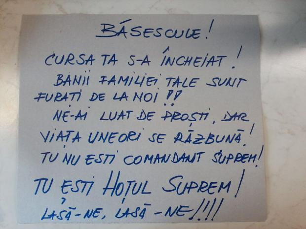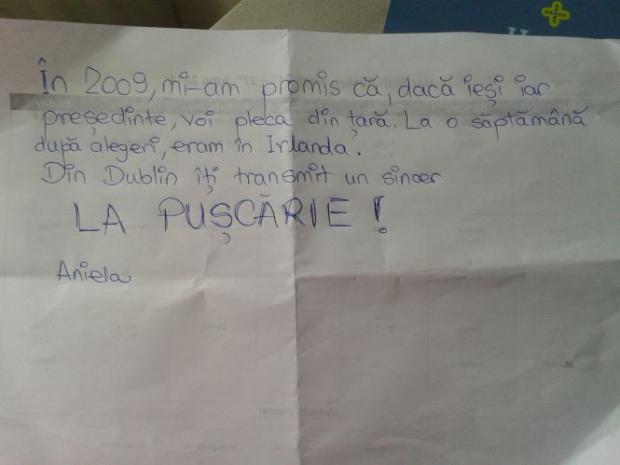 "Mi-as fi dorit sa raman in Romania.Dar se pare ca acest sistem infect si cei din fruntea lui nu are nevoie de noi,de tineri,de "verdele" tarii.Ne-au vrut outsideri.Ne-au aruncat in lume,ne-au abandonat.Nu ne-au dat de ales.Coruptia este atat de bine inradacinata in fibra presedintelui Traian Basescu incat ,o duce cu el ca pe un microb periculos,oriunde il poarta pasii.Faptele sunt clare ,inregistrate cu sunet si imagine.Au acceptat un morman de bani.S-au vandut,ne-au vandut.Lacomia si imoralitatea caracterizeaza clanul Basescu.JOS cu tine !Vrem Romania inapoi !Am ajuns economic intr-o situatie de cersetori din cauza ta si a clanului tau mafiot !Au dreptate cei care spun ca pestele de la cap se impute! ...A ingenunchia,a robi, a ucide patria , este tradare; a te sacrifica pentru patrie,....iata meritul ...D. BOLINTINEANU