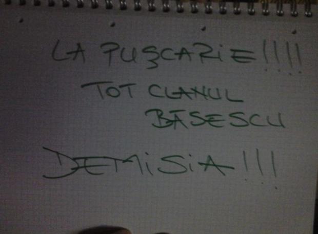 Românii îi cer demisia lui Traian Băsescu. Telespectatorii şi-au scris nemulţumirile faţă de presedinte şi ne-au trimis poze. "Ne-am săturat să ne fie ruşine cu tine!"; "Băsescu, demisia!" sau "Băsescu, n-ai onoare!" sunt doar cateva dintre mesajele oamenilor pentru preşedintele ţării.
