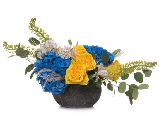 Din categoria de aranjamente premium, ideale atât pentru ocazii speciale, dar și pentru decorarea de zi cu zi a locuinței (sau chiar a biroului) îți prezentăm și acest Aranjament Floral Cu Hortensii Albastre Si Trandafiri Galbeni. După cum poți observa, este un aranjament special, realizat din hortensii albastre, eremurus galben, trandafiri galbeni, alstroemeria alba, pampas, eucalipt și un vas ceramic cu design modern, dar elegant.