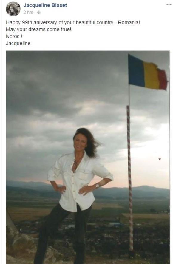 "La mulți ani cu ocazia împlinirii celor 99 de ani de când aveți această frumoasă țară - România! Fie ca visurile voastre să devină realitate! Noroc! - Jacqueline!", a scris aceasta pe pagina ei de Facebook.