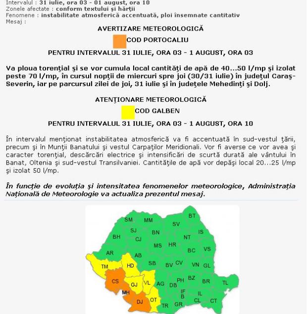Va ploua torenţial şi se vor cumula local cantităţi de apă de 40...50 l/mp şi izolat peste 70 l/mp, în cursul nopţii de miercuri spre joi (30/31 iulie) în judeţul Caraş-Severin, iar pe parcursul zilei de joi, 31 iulie şi în judeţele Mehedinţi şi Dolj.