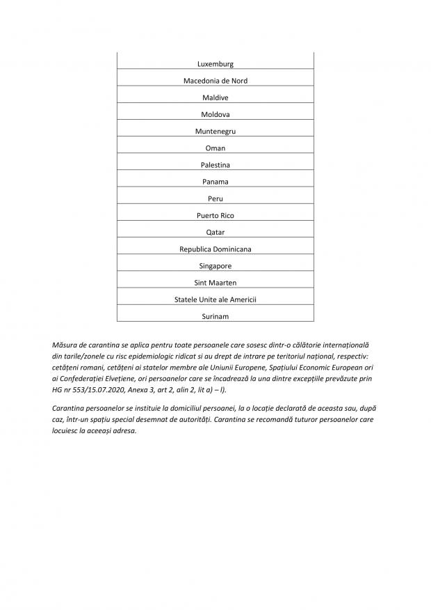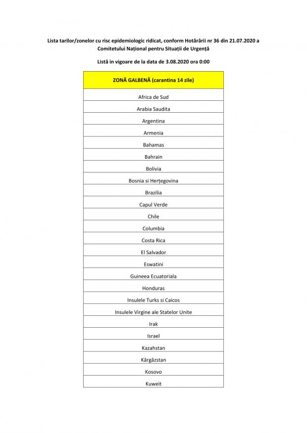 Pe noua listă sunt incluse 41 de state și zone cu risc epidemiologic ridicat, spre deosebire de 44 câte erau pe lista anterioară. Măsura carantinării se aplică de luni, 3 august. Măsura nu-i mai vizează pe cei care se întorc din Serbia și Rusia, două dintre țările care au ieșit din noua listă a „zonei galbene”.