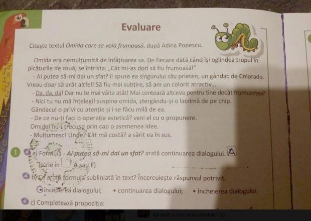 Elevii cred că o lecţie despre operaţiile estetice nu trebuie predată la şcoală, ci în familie. Revoltaţi, sute de părinţii au semnat o petiţie online, cerând eliminarea acestui text pe care îl consideră absurd pentru nişte copii de 8 ani.