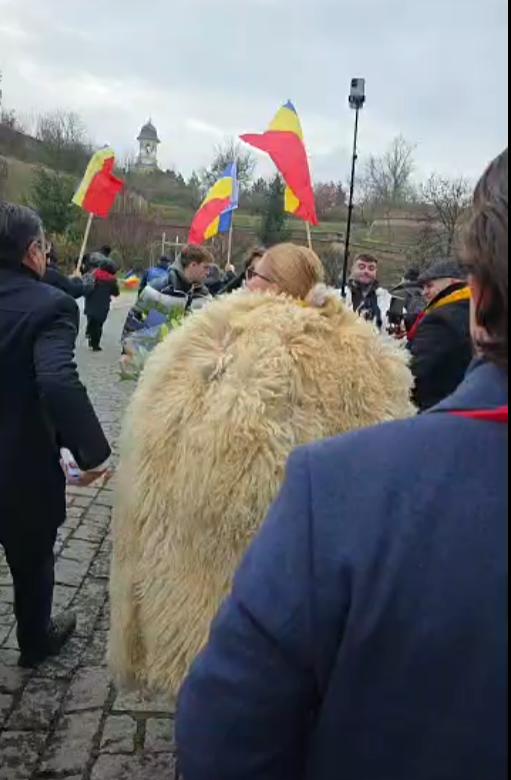 01 DecDiana Șoșoacă face live pe Facebook în timp ce merge prin cetatea Marii Uniri, în cojoc de oaie, însoțită de la mai multe persoane.