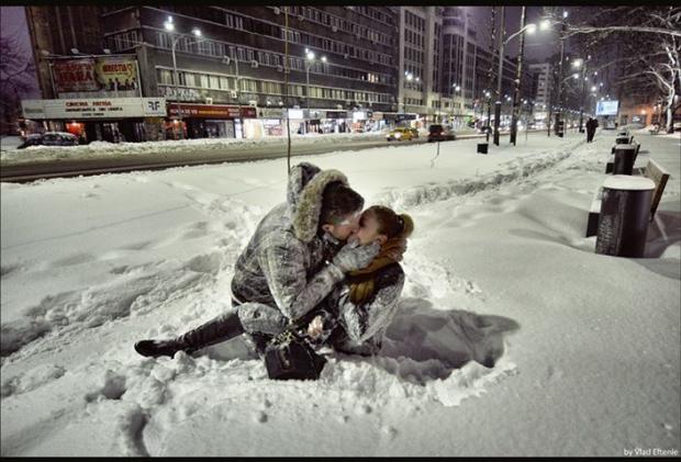 Fotografia a fost realizată pe Bulevardul Magheru, iar protagoniştii - doi îndrăgostiţi - n-au ţinut cont de frig şi de zăpada depusă pe trotuar, ci s-au sărutat fierbinte, după o trântă în nămeţi.