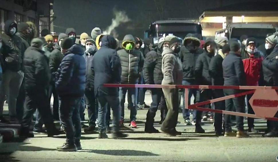 Unul dintre autobuze a fost lovit de greviști, iar forțele de ordine mobilizate în zonă au intervenit pentru a calma situația.