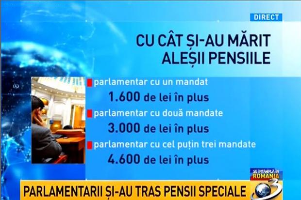 Actul prevede suplimentarea pensiilor parlamentarilor cu sume între 1.500 şi 4.400 de lei, în funcţie de numărul de mandate.