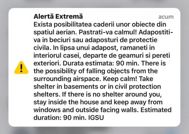 „Există posibilitatea căderii unor obiecte din spaţiul aerian. Păstraţi-vă calmul! Adăpostiţi-vă în beciuri sau adăposturi de protecţie civilă. În lipsa unui adăpost, rămâneţi în interiorul casei, departe de geamuri şi pereţii exteriori. Durata estimată: 90 min”, au anunţat oficialii din cadrul Inspectoratului General pentru Situaţii de Urgenţă în mesajul RO-ALERT.