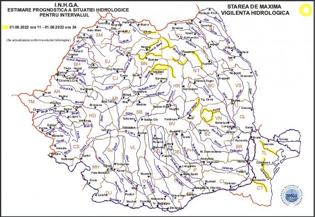 Avertizarea cod galben de inundații este valabilă în intervalul 1 august, ora 11:00 - 24:00.