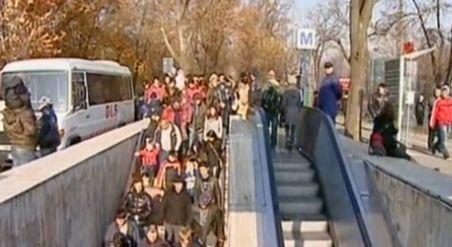 Scările rulante de la intrarea în metrou au devenit un bulevard supraaglomerat. Un poliţist a jucat rol de semafor.Următorul obstacol: uşile de metal de la intrarea în staţie.