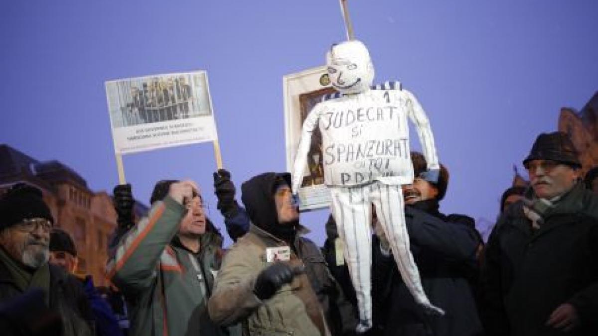 La un moment dat, cineva a adus o spânzurătoare cu funie, în care a fost agăţată o figurină ce reprezenta un cerşetor. Oamenii au spus că figurina îl reprezintă pe Traian Băsescu, pe care îl vor spânzurat, "să coboare de unde a urcat", iar participanţii au aplaudat.