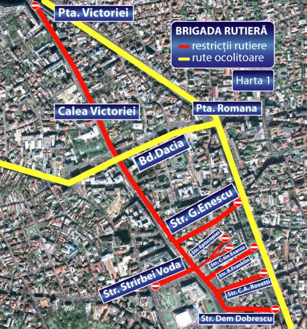 - din 31 decembrie, ora 20.00 până în 1 ianuarie 2013, ora 02.00, gradual, în funcţie de afluenţa publicului, pe Calea Victoriei, între Piaţa Victoriei şi strada Dem I. Dobrescu, precum şi pe străzile Ştirbei Vodă, între strada Luterană şi Calea Victoriei, George Enescu, Episcopiei, C-tin Esarcu, Dem I. Dobrescu şi C.A. Rosetti.
