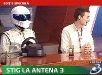 Pilotul de încercare al celebrei emisiuni Top Gear a aparut la sediul Antenei 3 în arhicunoscutul combinezon alb. Nu a părut impresionat nici măcar de întâlnirea cu vedeta Observatorului, Lucian Mândruţă. Stig este cel mai comod invitat. Nu bea nimic, nu mănâncă şi nici macar nu trebuie să treacă pe la machiaj. Stig a stat în studioul Antenei 3 preţ de două ore.