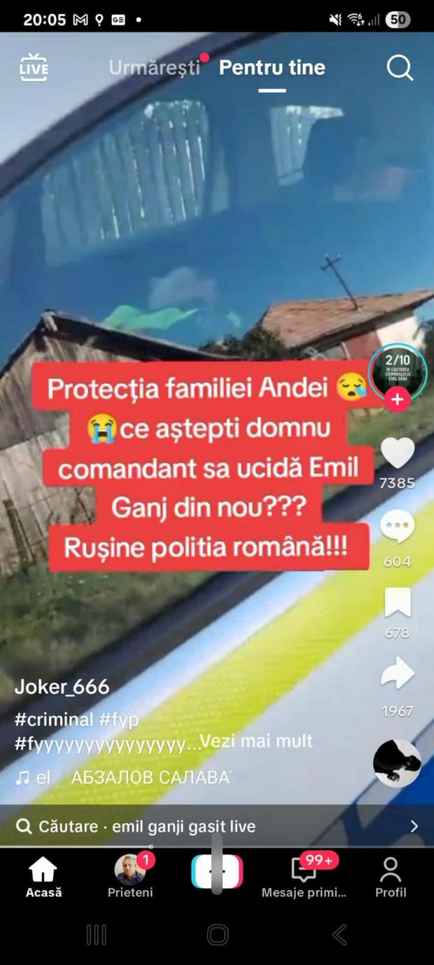 Inspectoratul de Poliție Județean Mureș a deschis o anchetă, după ce pe TikTok a apărut o înregistrare în care doi polițiști, care ar fi trebuit să păzească locuința rudelor Andei, tânăra din Mureș ucisă de Emil Gânj, dormeau. IPJ Mureș a transmis că imaginile au fost surprinse la începutul zilei de 23 iulie, după o tură de pază de 12 ore. Cei doi polițiști au fost deja audiați. De asemenea, instituția a atras atenția că „eventualele abateri individuale nu reflectă activitatea și dedicarea întregului colectiv de polițiști implicați”. Amintim că Emil Gânj este căutat, de 20 de zile, de sute de polițiști.