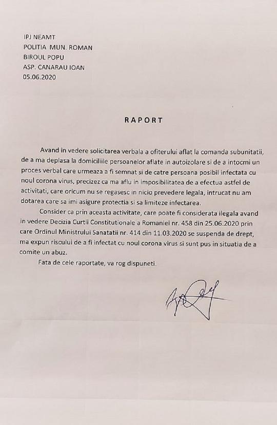 Conform sindicatului, unii dintre poliţişti s-au sesizat că solicitarea este abuzivă si au raportat că nu pot îndeplini astfel de sarcini fără fi dotaţi cu materiale care să le asigure protecţia, fiind prezentat raportul unui poliţist de la Roman.