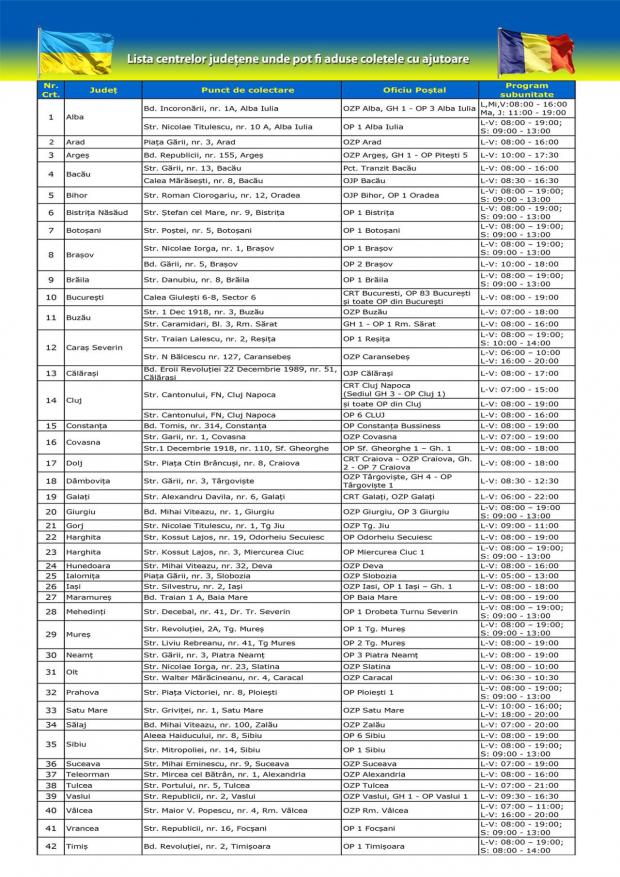 Cetățenii sau ONG-urile care doresc să trimită ajutoare umanitare în Ucraina, au la dispoziție centrele județene dedicate acestei campanii, care vor prelua coletele. Aici, produsele vor fi încărcate în mașinile companiei și vor fi transportate către cele patru puncte de trecere a frontierei cu Ucraina. De aici, vor fi preluate de Poșta Ucraineană - Ukrposhta și distribuite acolo unde este nevoie, transmite Poşta Română.